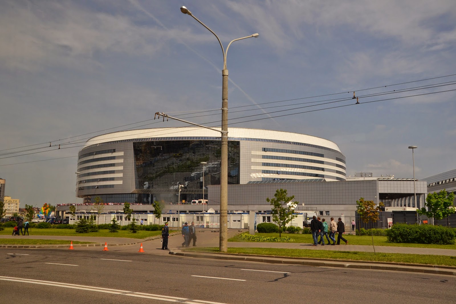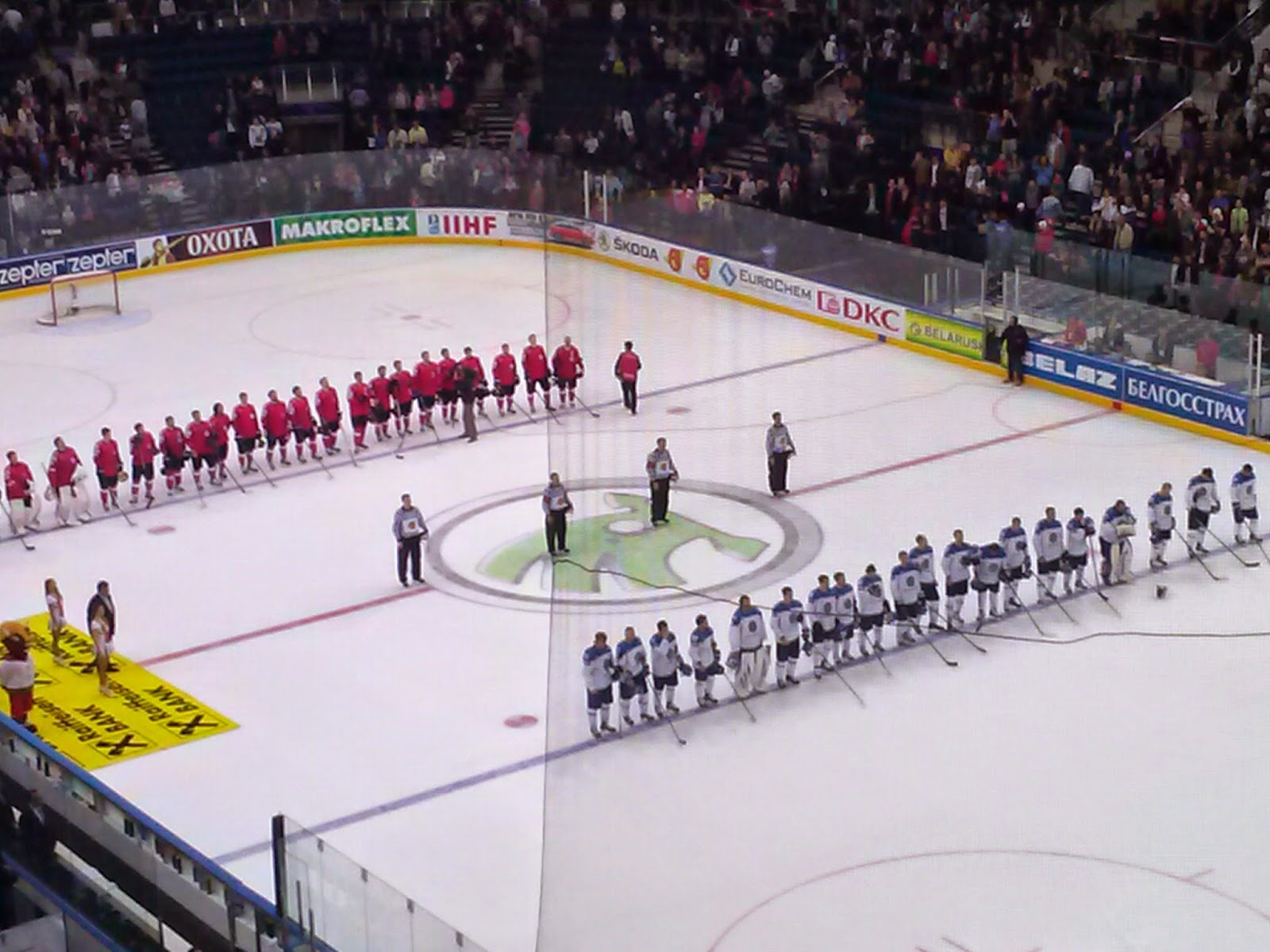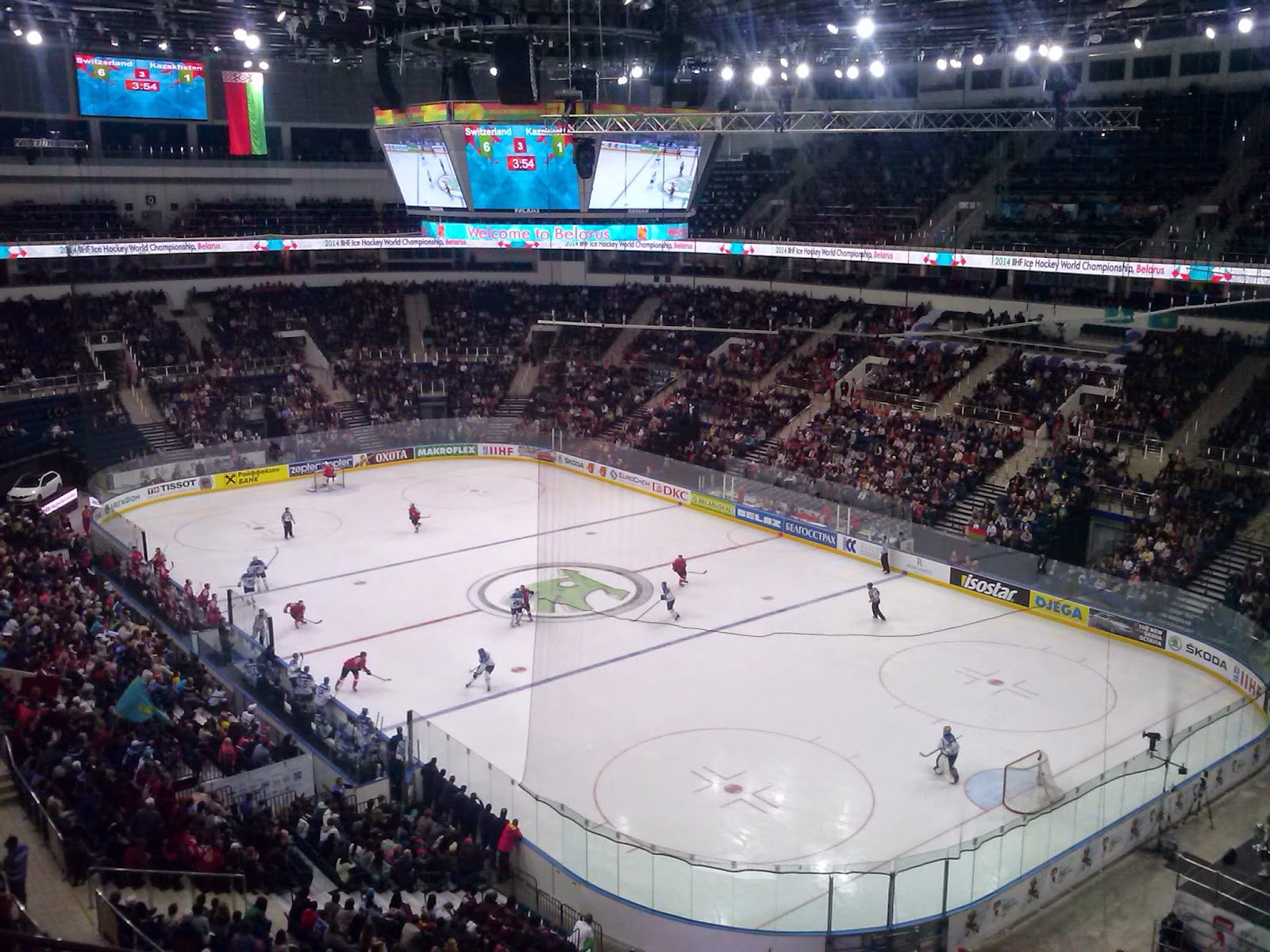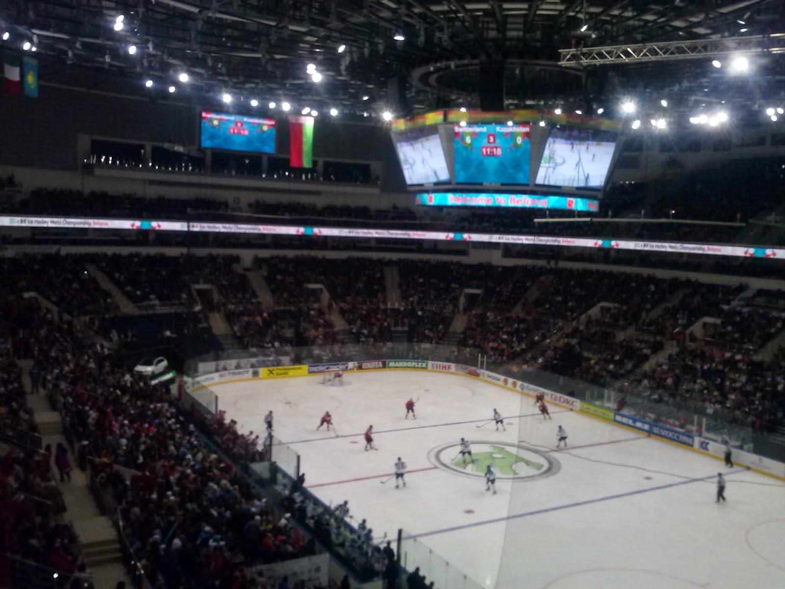 Wieczorem wybraliśmy się na główną arenę mistrzostw, czyli do Hali Mińsk (pojemność 15000), gdzie odbywał się mecz Szwajcaria – Kazachstan. Nowoczesna hala robiła naprawdę duże wrażenie, my kibicowaliśmy Kazachstanowi, bo jeszcze w Teheranie obiecaliśmy konsulowi tego kraju że na MŚ będziemy im kibicować, a że słowo droższe o pieniędzy to gardło z Dominikiem zdzieraliśmy. Niestety nasza drużyna przegrała 6 – 2. Po meczu wróciliśmy do hostelu na małą imprezę, a później mieliśmy ruszyć na juwenalia, niestety pogoda się bardzo zepsuła i zmuszeni byliśmy skończyć zabawę w hostelu. Może i lepiej bo na drugi dzień człowiek i tak wstał z bólem głowy.