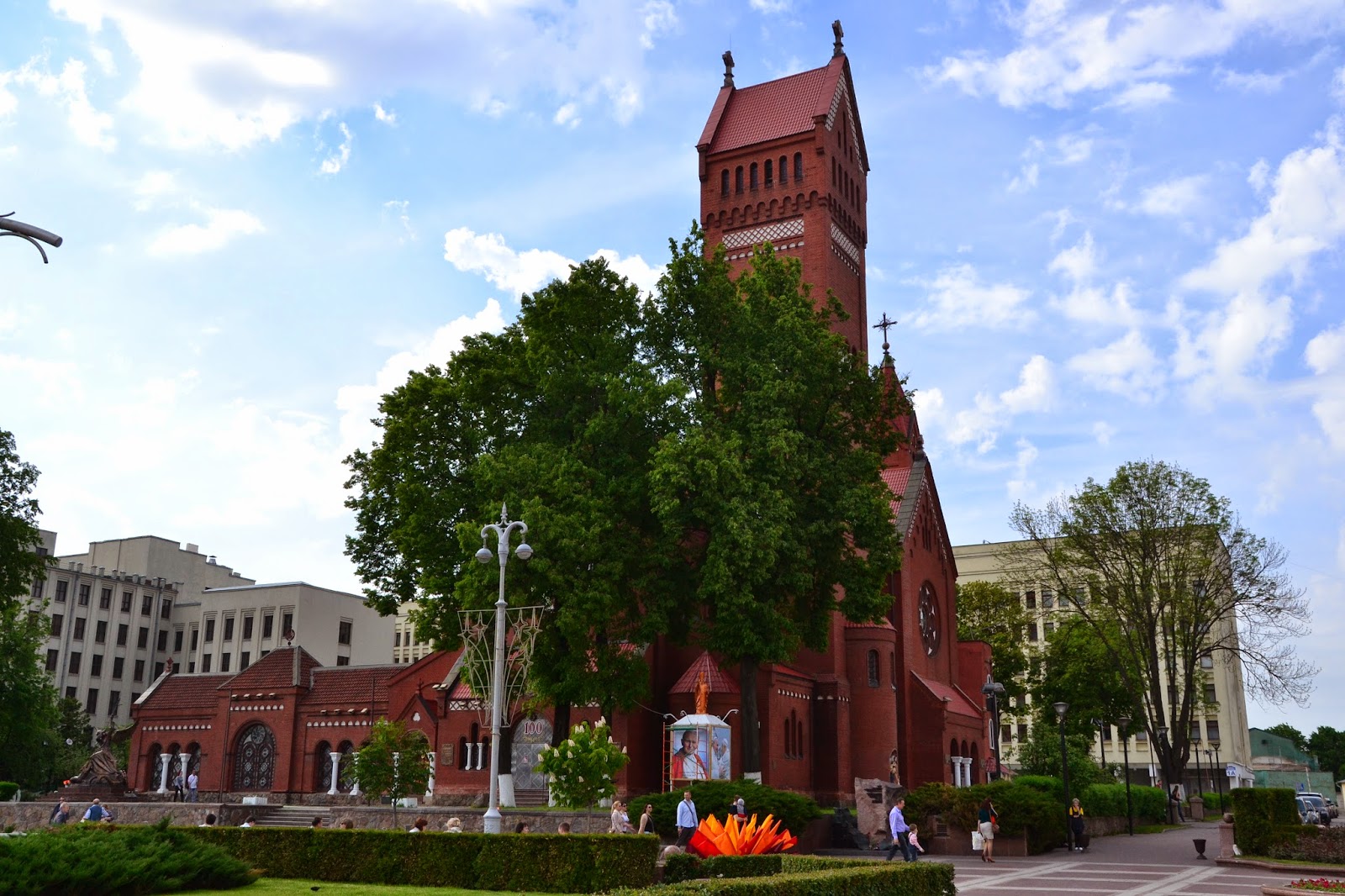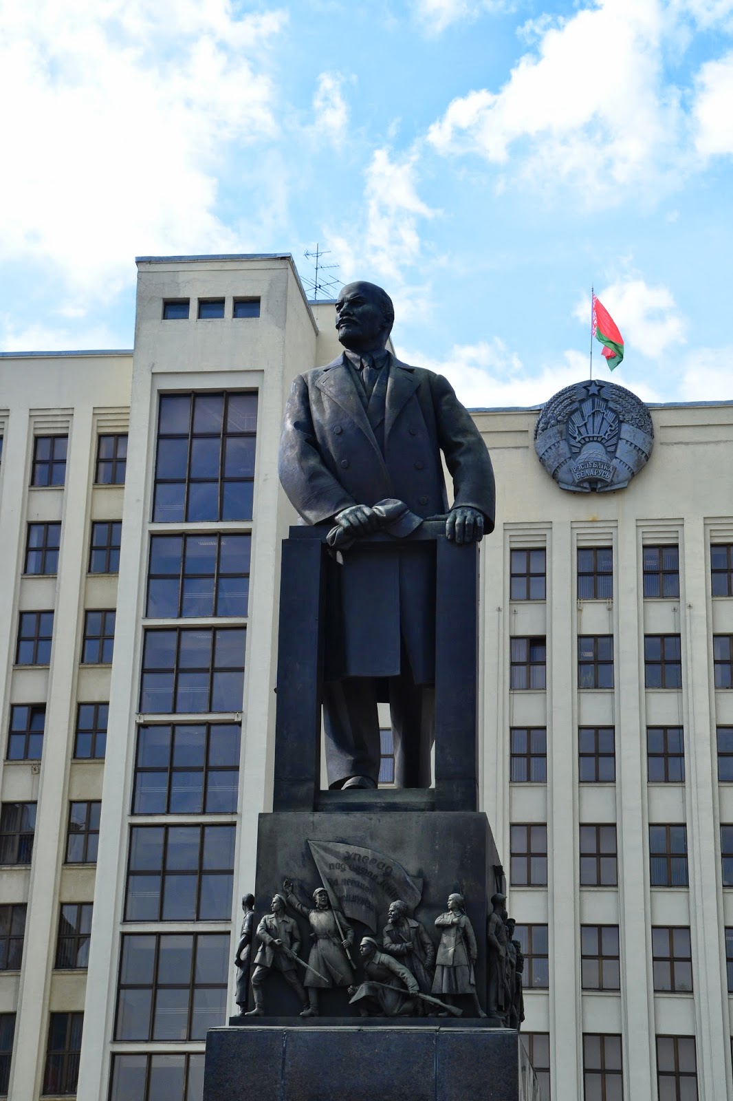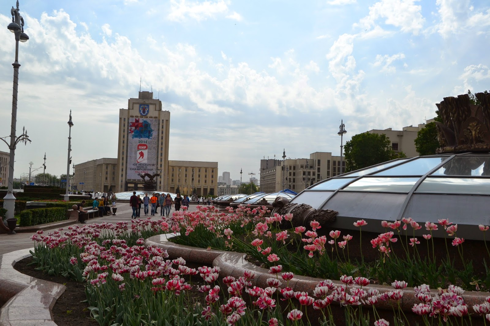 Drugiego dnia ruszyliśmy na zwiedzanie Mińska. O Białorusi można mieć różne zdania, ale przyznać trzeba że stolica prezentuje się naprawdę okazale. Czyste, bardzo zadbane ulice, odnowione, kolorowe budynki, sporo zieleni i bardzo dużo budów. Jeśli ktoś uważa że postkomunistyczne miasto musi być szare to zdecydowanie nie był w Mińsku, mimo że na każdym kroku widać insygnia wcześniejszego ustroju, z pomników straszą twarze komunistów, najważniejsza ulica Mińska nazwana jest imieniem Lenina, a prospektem Dzierżyńskiego nazwano ulicę prowadzącą przez całą stolicę do centrum. Ciężko jest mi powiedzieć jak wygląda miasto na co dzień, bo widać było że wszyscy żyją tam trwającą imprezą hokejową.