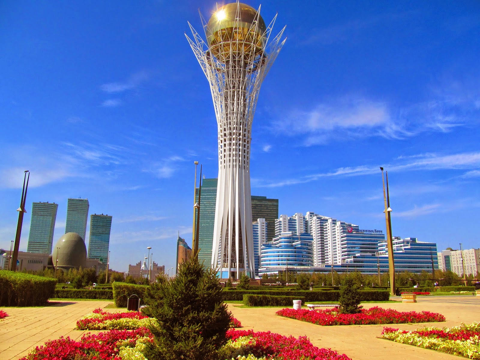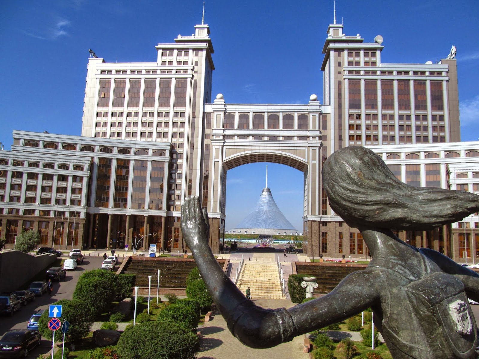| Gmach ministerstwa ropy i gazu na tle największego centrum handlowego w Azji Środkowej (budynek w kształcie jurty). |