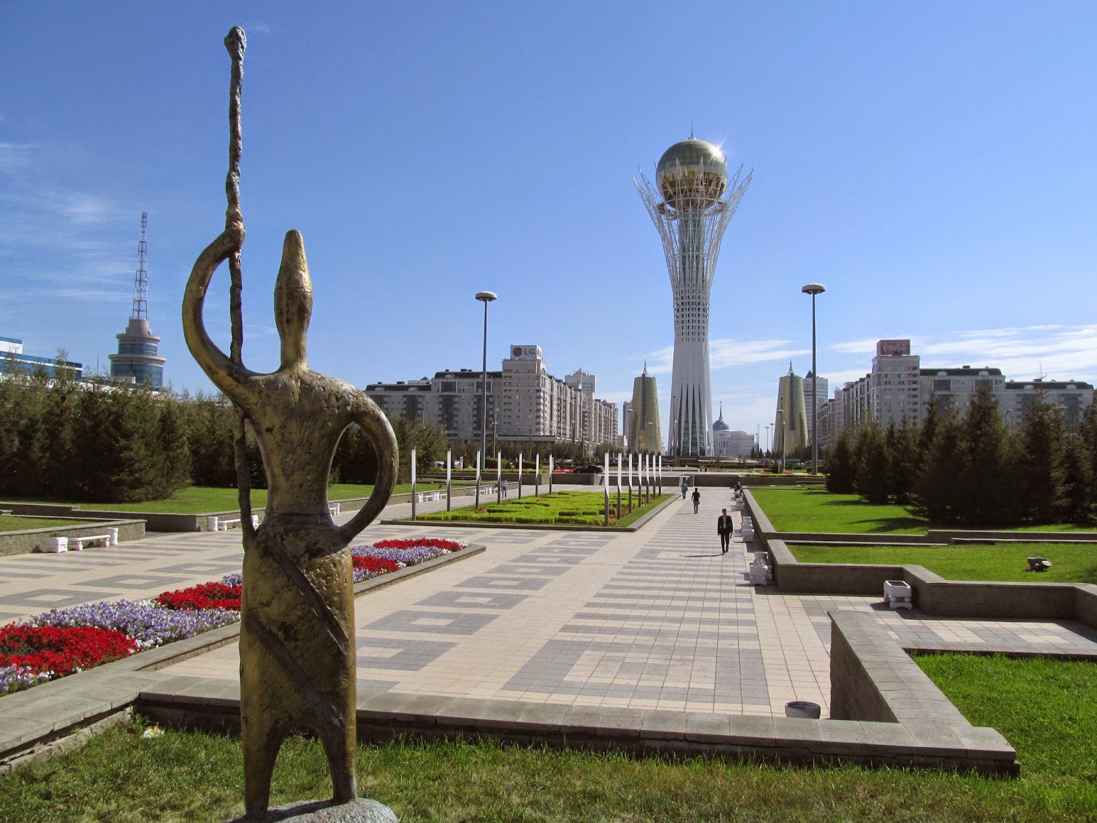 Piotr i Dominik byli zachwyceni Aszchabadem, stolicą Turkmenistanu. Wspólnie oglądaliśmy zdjęcia. Bogate miasto wyłożone marmurem, monumentalna nowoczesna architektura. Z drugiej strony: puste ulice, niedostępność i zamkniętość kraju. Opowieści chłopaków wskazują ponadto na dużą nieufność ludzi i wszechobecność służb zabraniających fotografowanie budynków. Wszystkie te czynniki (wraz ze sporymi trudnościami wizowymi) sprawiają, że ciężko rekomendować Aszchabad do podróżniczej kategorii „must see”. Najbardziej imponującym i zdecydowanie wartym polecenia miastem Azji Środkowej jest natomiast Astana, która robi tak duże wrażenie, że Ewa do dzisiaj ma na tapecie swojego „smartfona” zdjęcie wykonane w stolicy Kazachstanu we wrześniu ubiegłego roku. Spędziliśmy tam kilka godzin, spacerując między największą jurtą na świecie a pałacem prezydenckim. Największą atrakcją tej reprezentacyjnej osi jest Bajterek, wieża widokowa zaprojektowana przez słynnego architekta Normana Fostera z okazji przeniesienia stolicy z Ałmaty w 1997 roku. Zresztą, co ja się będę w tym miejscu rozpisywał, zerknijcie proszę na zdjęcia
