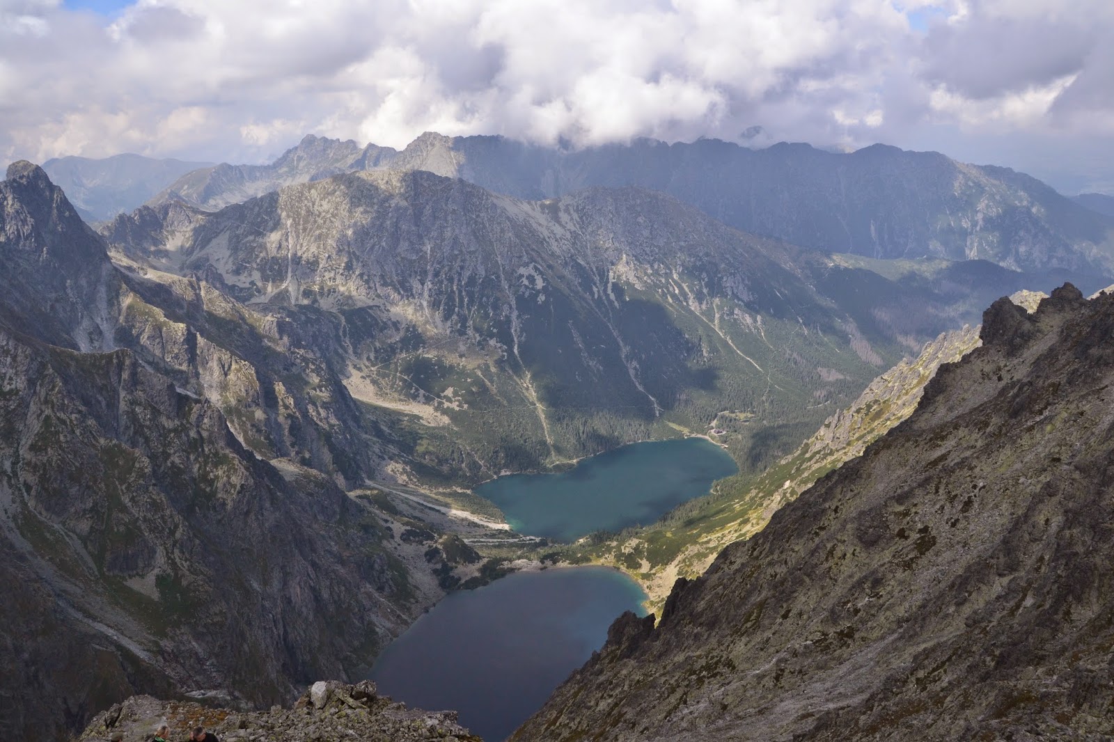 Z tego miejsca zaczyna się już 2 godzinne podejście do Chaty pod Rysami na wysokości 2250 m n.p.m. Po drodze mamy mniej wymagające i bardziej wymagające etapy, łącznie z jednym podejściem na łańcuchach, ale nie jest ono bardzo trudne. Gdzieś w połowie drogi znajduje się Żabia Dolina i Żabie Jezioro Mięguszowickie nad którym zrobiliśmy sobie przerwę na śniadanie. Potem kolejne podejście do schroniska i tam kolejna przerwa tym razem na piwo (koszt 3 euro, ale w takim miejscu zawsze warto wypić piwo i wznieść toast) i na toaletę, a ta zalicza się do najbardziej osobliwych na świecie. Toaleta to niby zwykła latryna, a wyróżnia ją brak frontowej ściany, zamiast tego jest szyba i piękny widok na panoramę tatr, toaleta znajduje się na skarpie, więc osoby z lękiem wysokości mogą mieć problem ze skorzystaniem, albo może im to wyjść nad wyraz łatwo. W okolicy można spotkać jeszcze dwie osobliwości, jedna to przystanek autobusowy, niestety żaden autobus nie przyjechał, a druga to bramka z chorągiewek jakie można spotkać w Nepalu z modlitwami.