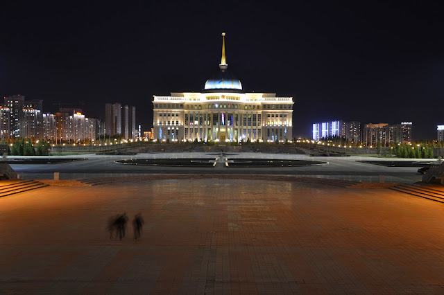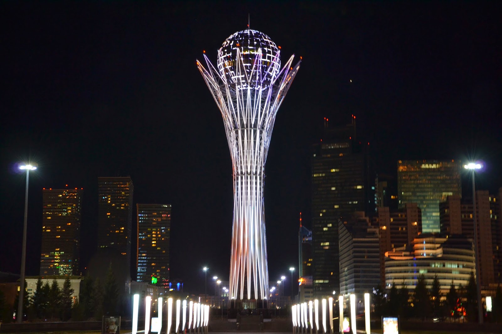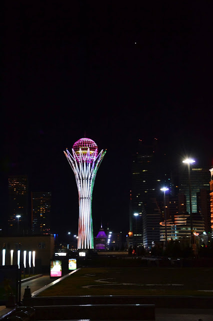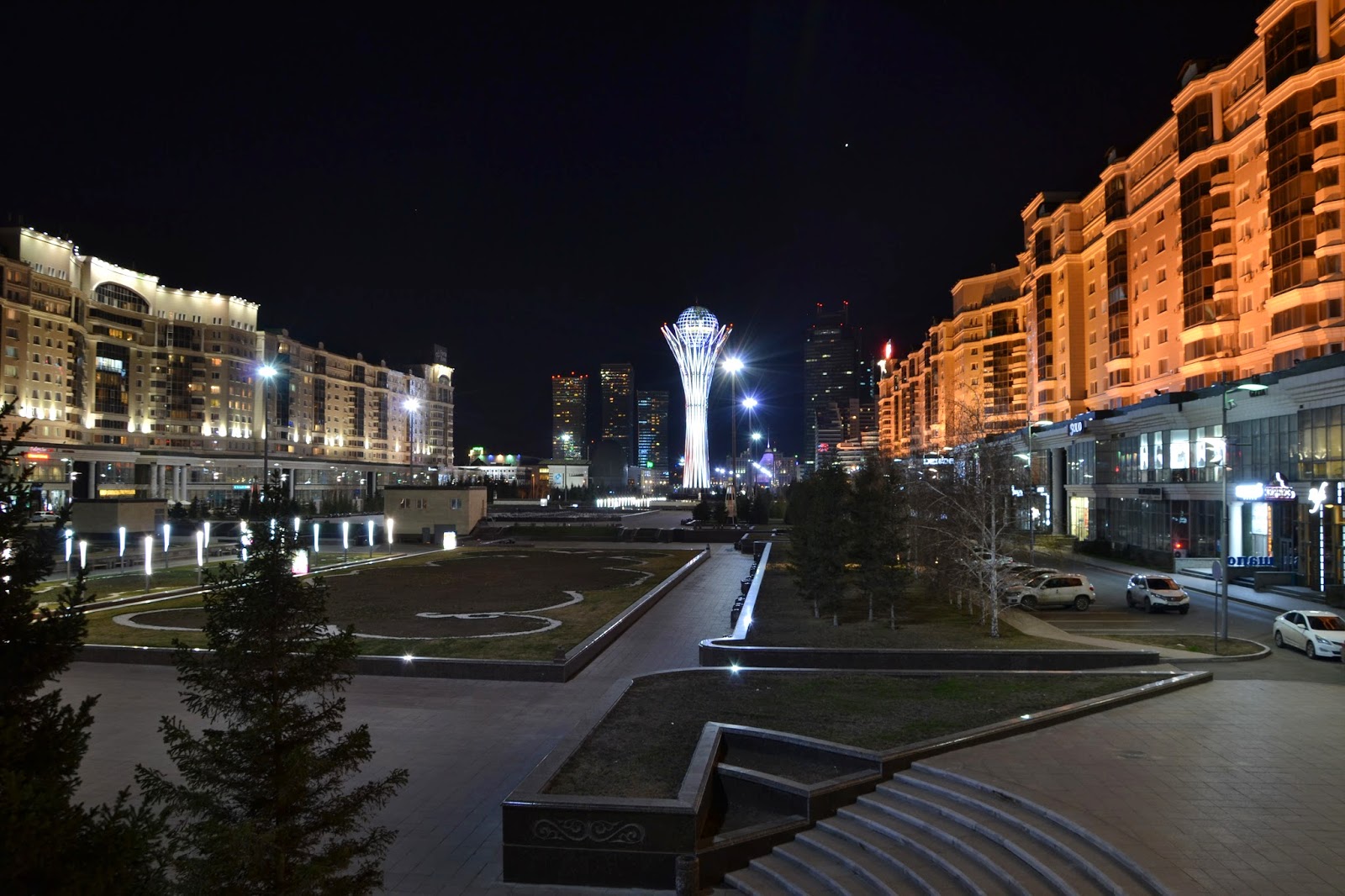 Wstałem rano, szybki prysznic i w miasto. Najpierw Pałac prezydencki po sąsiedzku, potem główny meczet, piramidę i wieżę widokową w której wypiłem kawę, aż do centrum handlowego w kształcie namiotu cyrkowego. Niesamowite w Astanie jest to że wszystkie ale to wszystkie atrakcje turystyczne są w jednej linii, a całe miasto jest prawie symetryczne do tej właśnie lini. Swoją drogą muszę sprawdzić czy to jest dokładnie północ-południe czy nie. W każdym razie Astanę spokojnie można obejść za jeden dzień I nic się nie pominie. Samo miasto budzi u mnie mieszane uczucia z jednej strony ciekawe i nowoczesne, a z drugiej brak mu duszy, przez co szybko się nudzi. Cóż mogę powiedzieć, mnie nie urzekło. Tak szwędając się po mieście zleciał mi cały dzień, na wieczór zaplanowałam jeszcze spacer z aparatem po nocnej Astanie, niestety nie zmienił on mojego zdania, mimo że wszystko było pięknie oświetlone. W zasadzie miłym akcentem było spotkanie i delikatne dziabnięcie Kazachskiej wódeczki że współlokatorem, który pracował w ministerstwie ropy i gazownictwa.