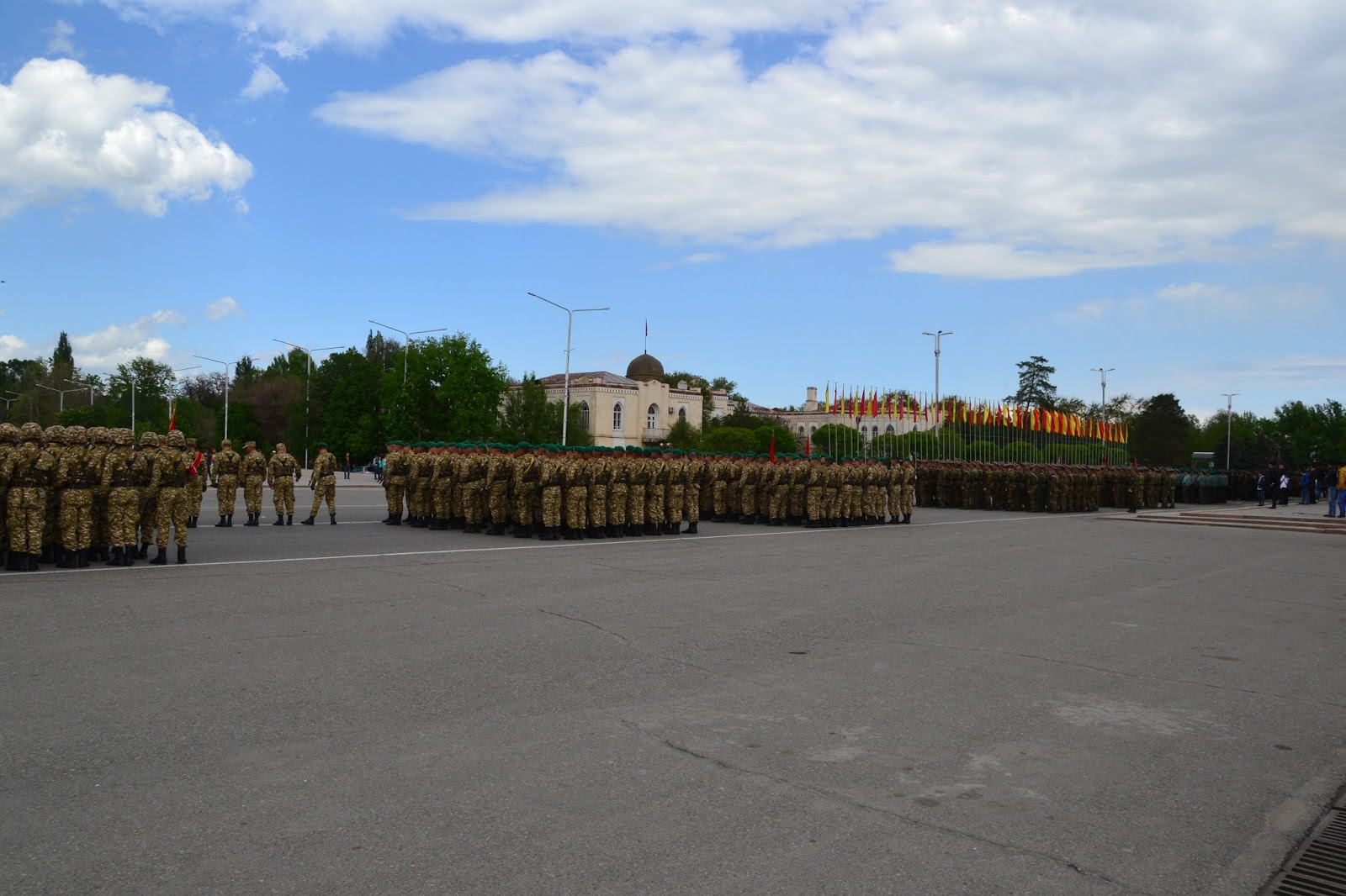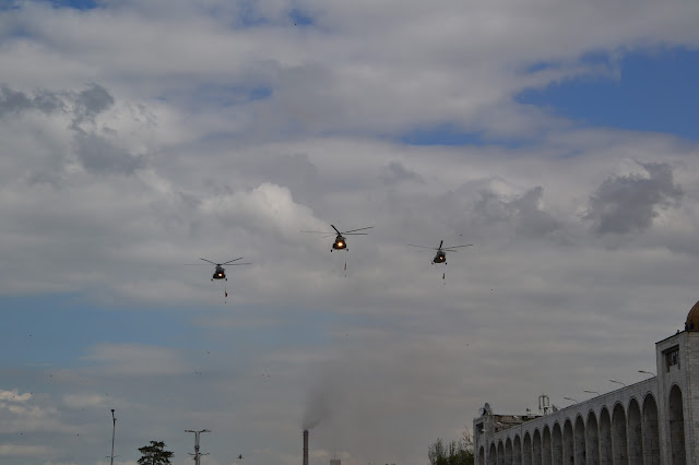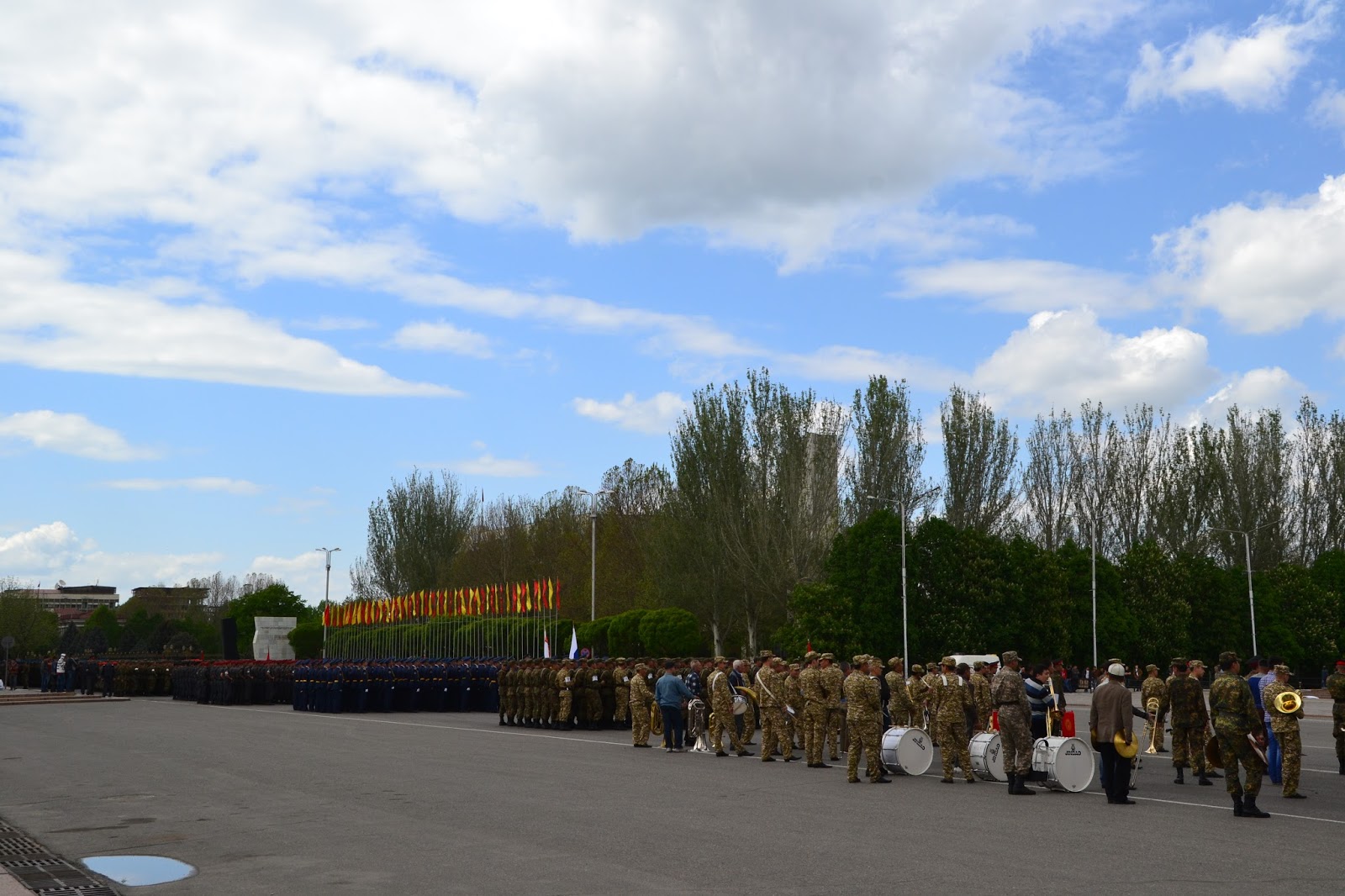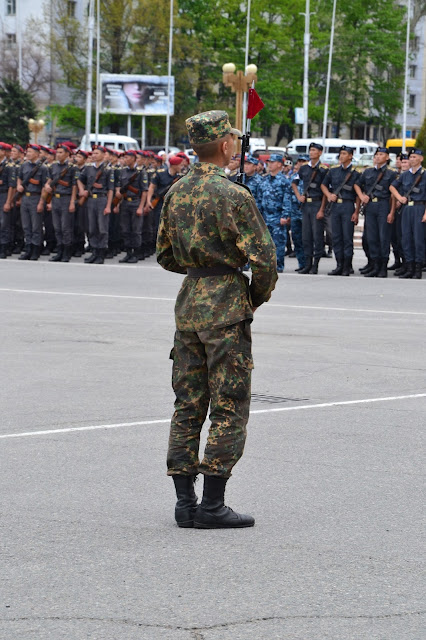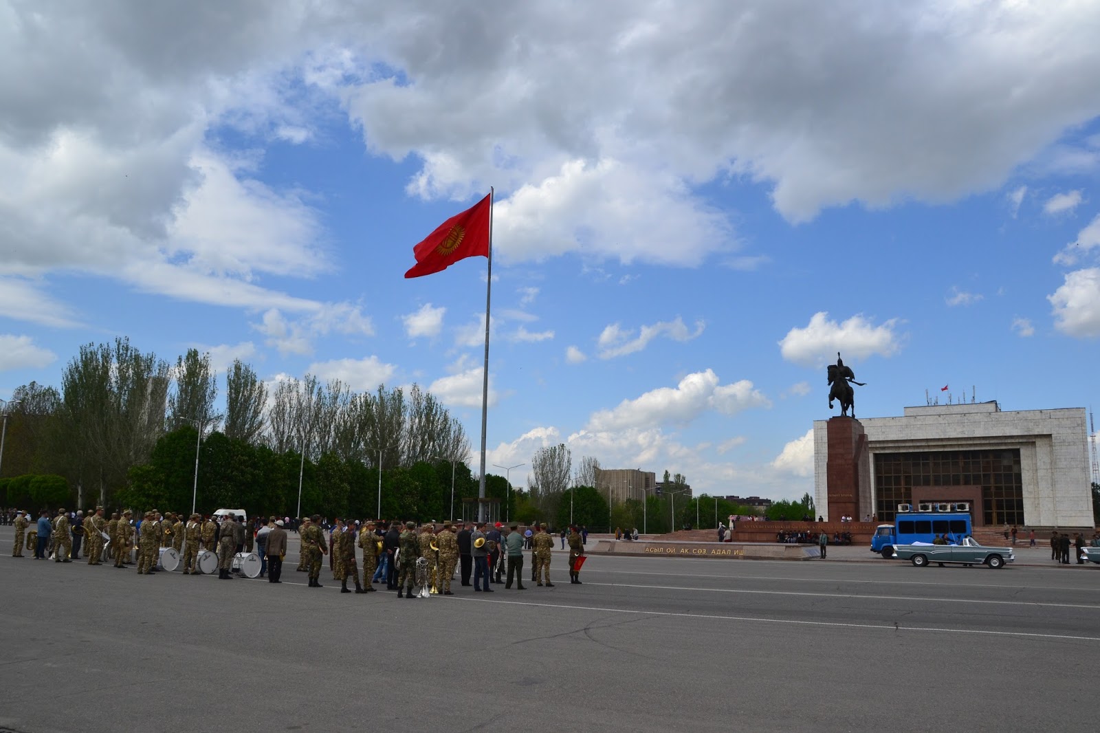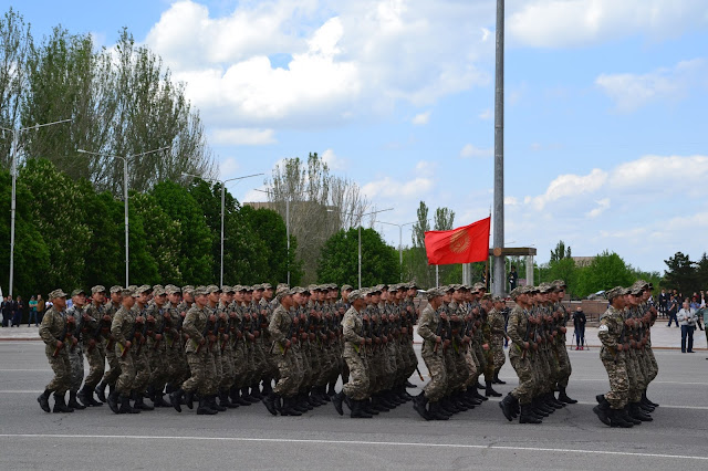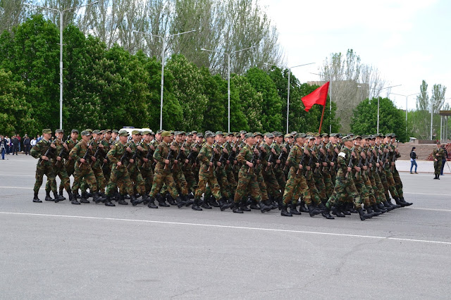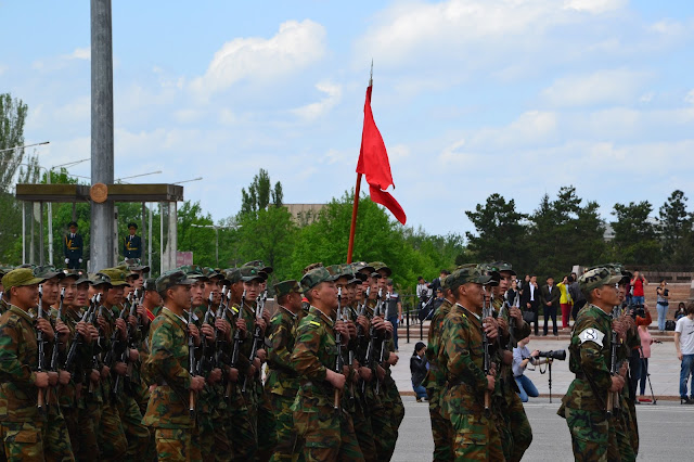 Dochodząc do centrum w oddali słyszałem dźwięki grającej orkiestry, gdy doszedłem na głównego placu zobaczyłem co się dzieje. Grała orkiestra, niby to wojskowa, ale dziwna bo mundurowi byli przeplatani z cywilami, po chwili z obu stron placu krokiem paradnym w maszerowali na niego żołnierze, policjanci, celnicy i wszelkie formacje mundurowe. Zaraz zrozumiałem co się dzieję, trafiłem na próbę parady z okazji dnia pobiedy. Jako że sam dzień pobiedy miałem spędzić gdzieś w Pamirze, to chociaż tutaj miałem okazję zobaczyć namiastkę tych legendarnych defilad. I muszę przyznać że mimo iż była to próba, to robiła wrażenie. Próby trwały wiele godzin, ja w pewnym momencie muszę przyznać że się już znudziłem próbami i ruszyłem dalej w miasto, z planem odwiedzenia bazaru.