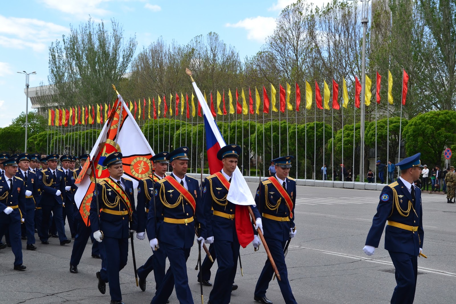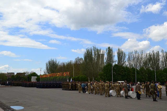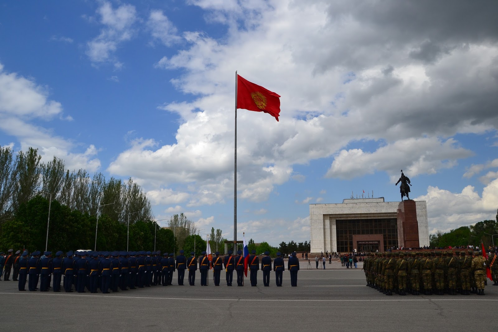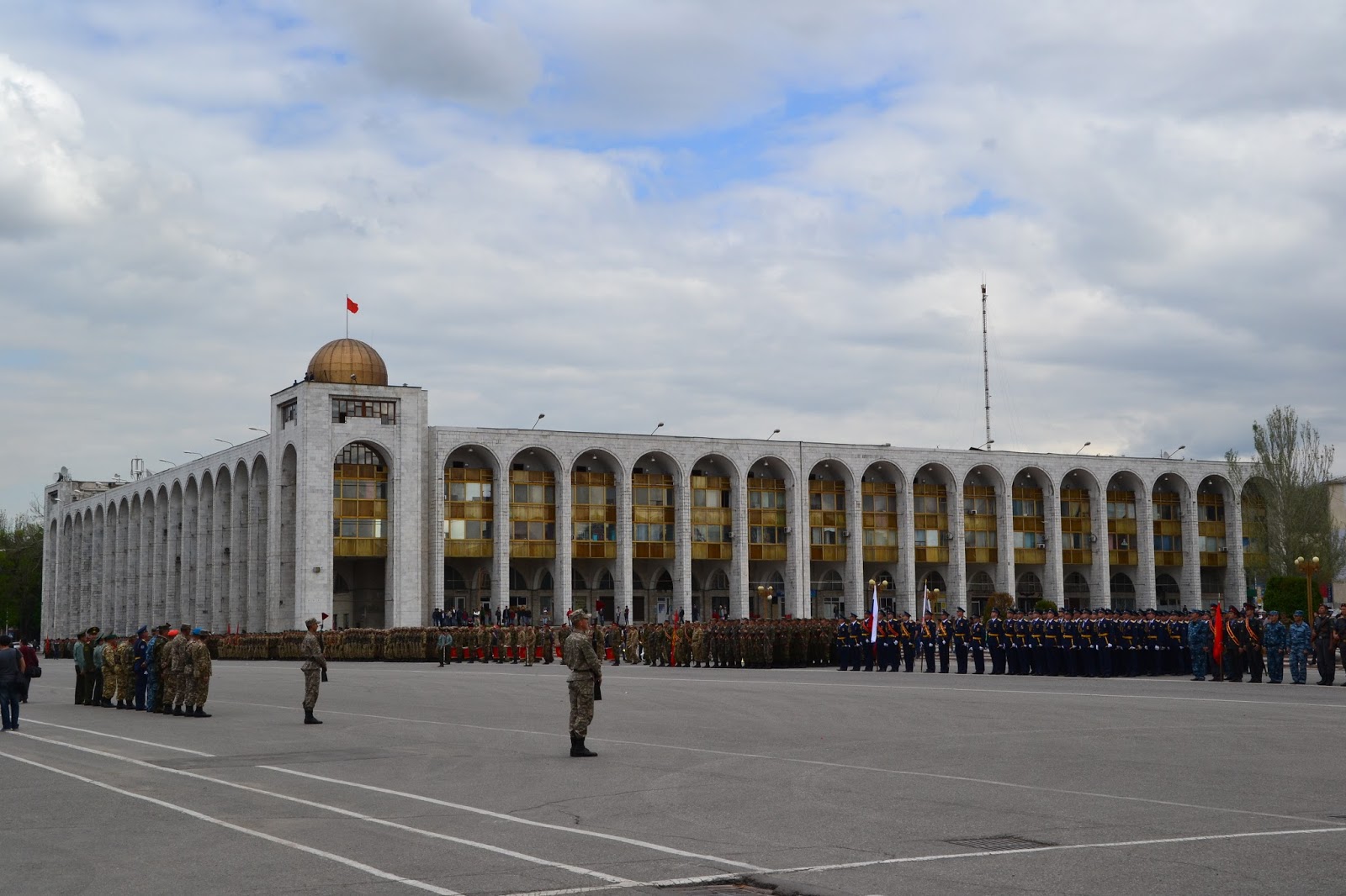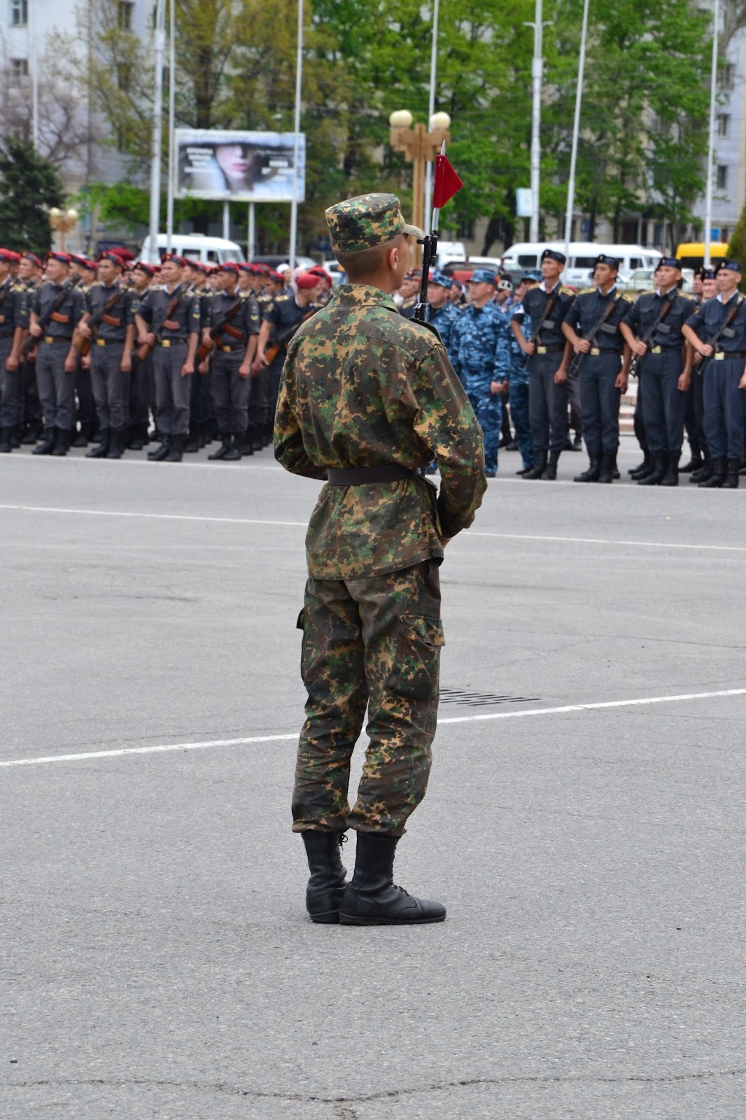 Dochodząc do centrum w oddali słyszałem dźwięki grającej orkiestry, gdy doszedłem na głównego placu zobaczyłem co się dzieje. Grała orkiestra, niby to wojskowa, ale dziwna bo mundurowi byli przeplatani z cywilami, po chwili z obu stron placu krokiem paradnym w maszerowali na niego żołnierze, policjanci, celnicy i wszelkie formacje mundurowe. Zaraz zrozumiałem co się dzieję, trafiłem na próbę parady z okazji dnia pobiedy. Jako że sam dzień pobiedy miałem spędzić gdzieś w Pamirze, to chociaż tutaj miałem okazję zobaczyć namiastkę tych legendarnych defilad. I muszę przyznać że mimo iż była to próba, to robiła wrażenie. Próby trwały wiele godzin, ja w pewnym momencie muszę przyznać że się już znudziłem próbami i ruszyłem dalej w miasto, z planem odwiedzenia bazaru.