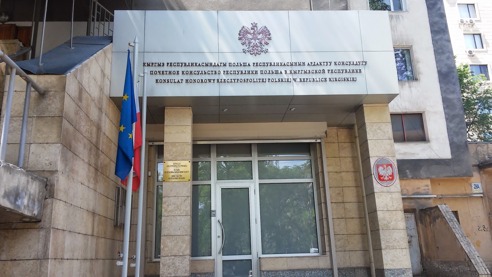 Budzik zadzwonił o 7, chciałem szybko załatwić wizę, żeby móc ruszać dalej. Szybki prysznic i na piechotę do ambasady, co zajęło mi trochę ponad godzinę, w sumie dobrze wyszło bo otwarta była dopiero od 9, a ja byłem chwilę po. Okazało się że wiza jest gotowa, paszport czeka na odebranie, czyli dzisiaj ruszam do Osz. Rzeczy zostawiłem u Ojca Remigiusza, który jak mi wcześniej zapowiedział dzisiaj będzie miał sporo roboty i nie będzie mógł mnie odwieźć na dworzec. To żaden problem jak go zapewniłem, przecież cały czas wszędzie sobie radzę to tym razem też dam radę. Kiedy wróciłem po swoje rzeczy mój gospodarz już wstał, zjedliśmy razem śniadanie i okazało się że plany mu się trochę zmieniły, odwiezie mnie na dworzec, a wcześniej jeśli mam chęć mogę z nim pojechać do honorowego konsulatu Polski w Biszkeku, który według strony Polskiego MSZ nie istnieje, no a chęć oczywiście miałem.