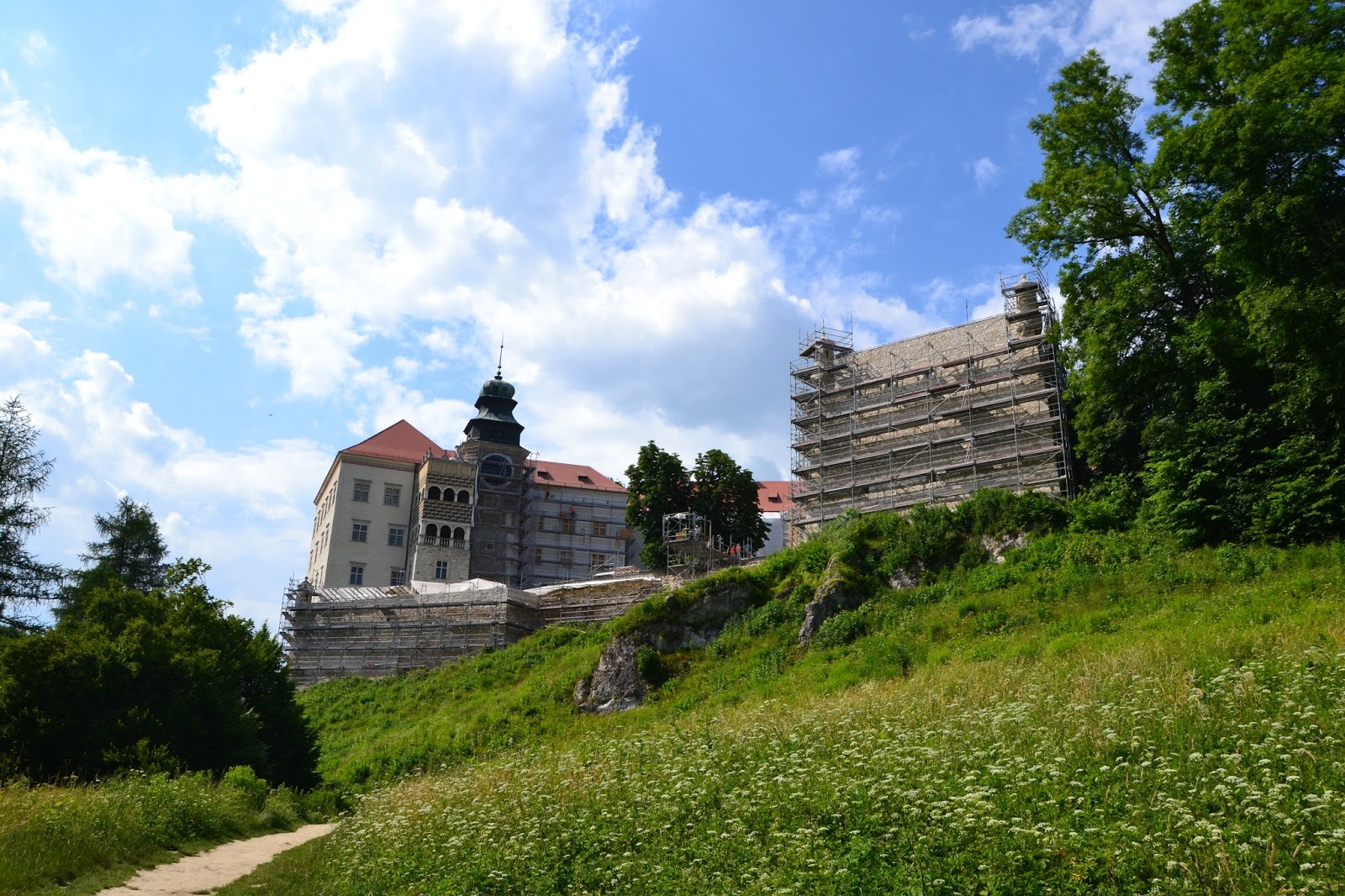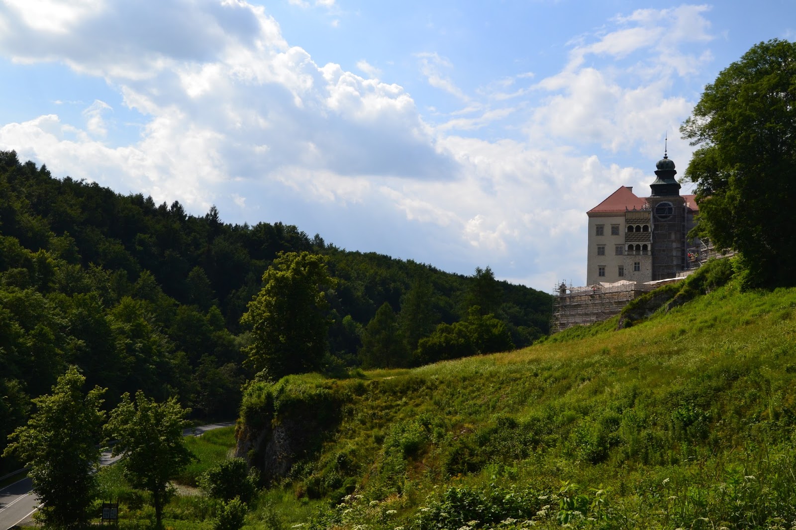 Pierwszy zamek jaki napotkamy tego dnia to Zamek na Pieskowej Skale*, oddalona od Ojcowa o jakieś 7km. Niestety jest ona w tym momencie remontowana i niedostępna dla Turystów, planowe otwarcie ma nastąpić dopiero w 2016 roku. Można natomiast obejść zamek dookoła, zobaczyć jedną z najbardziej znanych i charakterystycznych skał Jury, czyli Maczugę Herkulesa. Zamek na Pieskowej Skale jest oddziałem Wawelskiego Muzeum Narodowego.