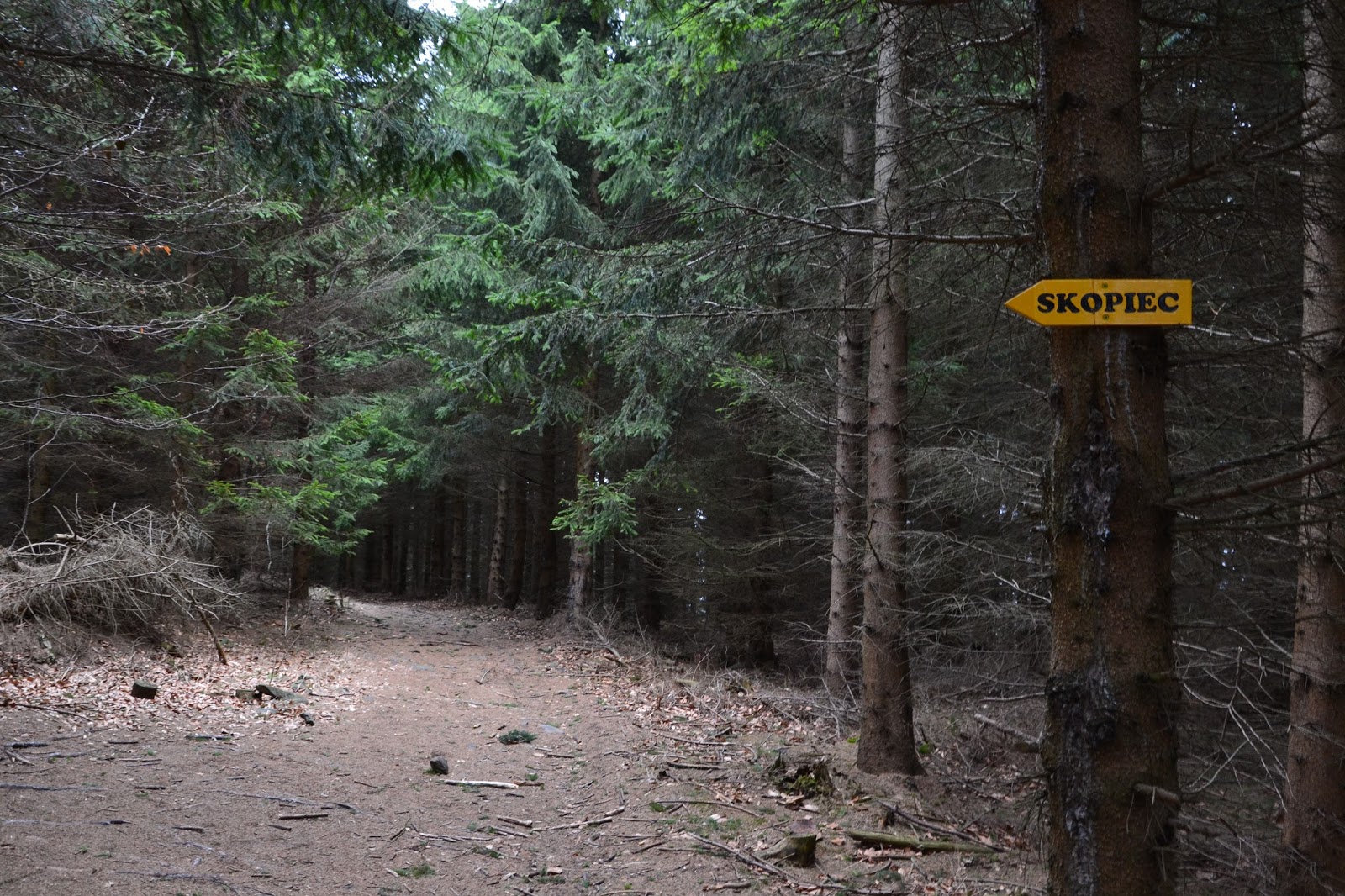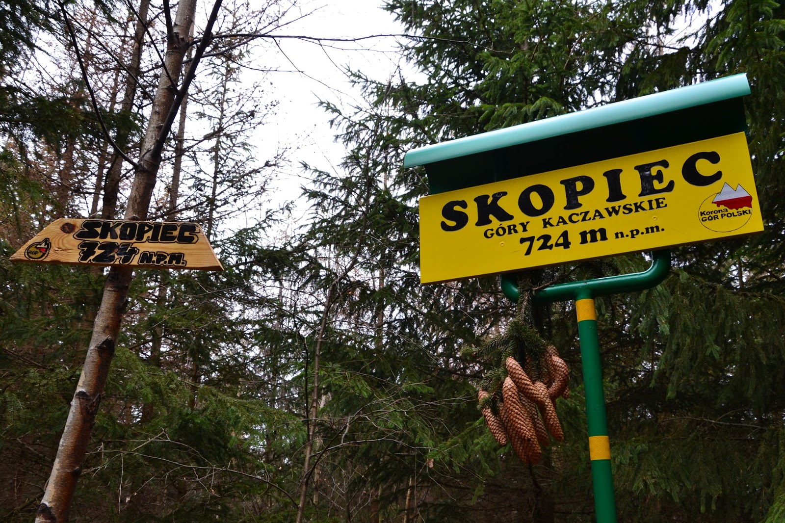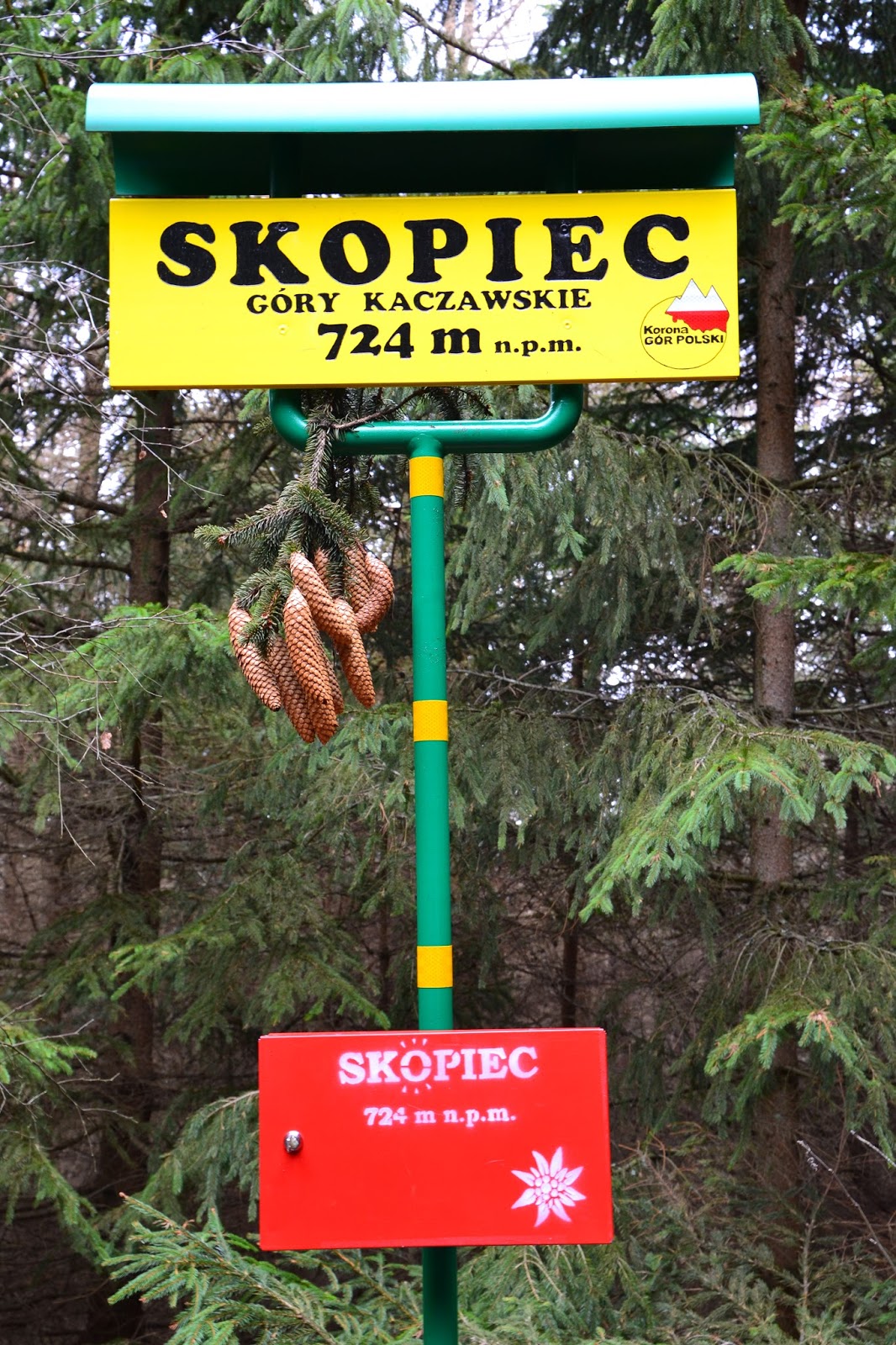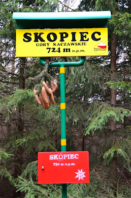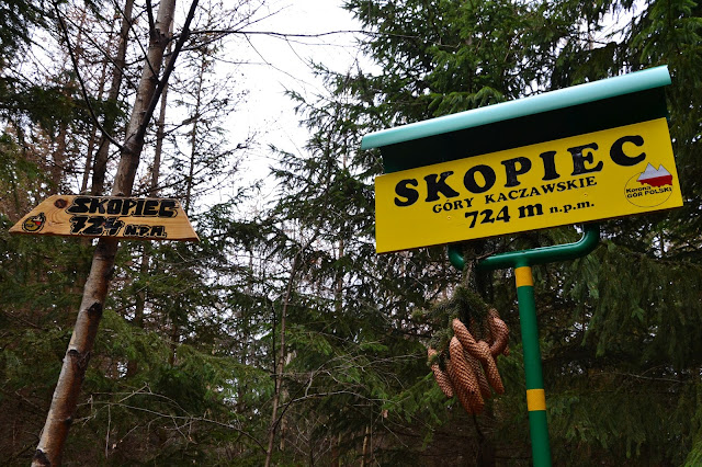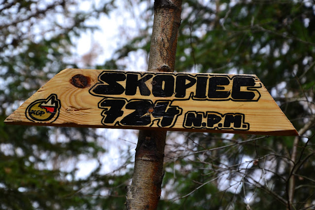 Na Skopiec, a w zasadzie na sam szczyt nie prowadzi żaden szlak, ale jest ścieżka i jest również oznakowana. Na miejscu czeka na nas nowiutka tablica z KGP, oraz skrzyneczka gdzie pozostawione są różne fanty i przede wszystkim pieczątka którą możemy podbić sobie książeczki.