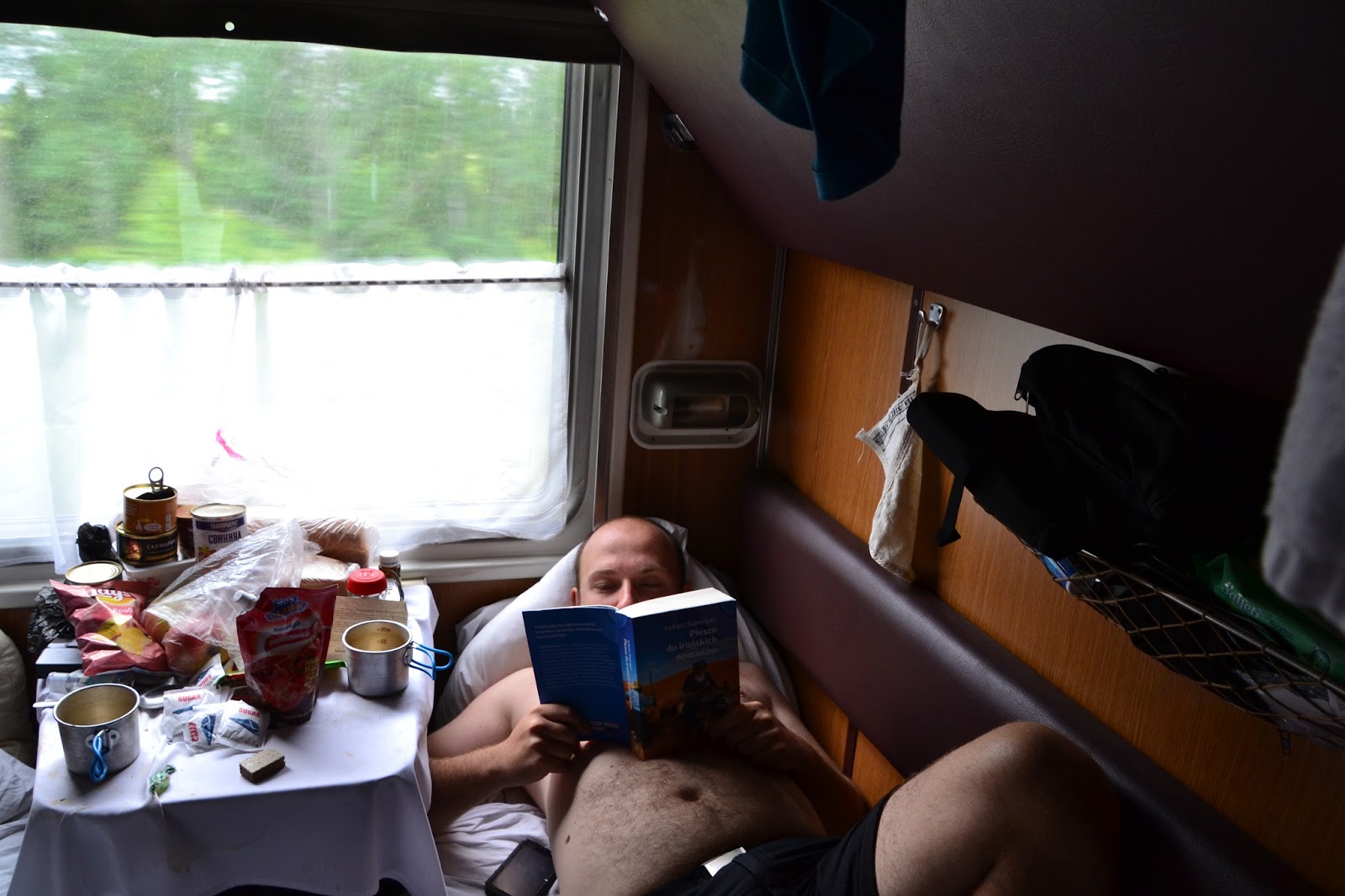 | W transsybirze zaczytuję się książką pt. „Pieszo do irańskich nomadów” Łukasza Supergana |